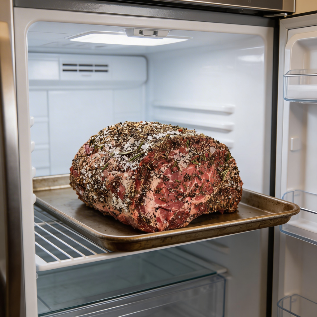 The day before you plan to roast your prime rib, season it liberally on all sides with salt and pepper.  Place the roast on a heavy baking sheet with the fat cap side up and refrigerate, uncovered, overnight (or up to 24 hours).